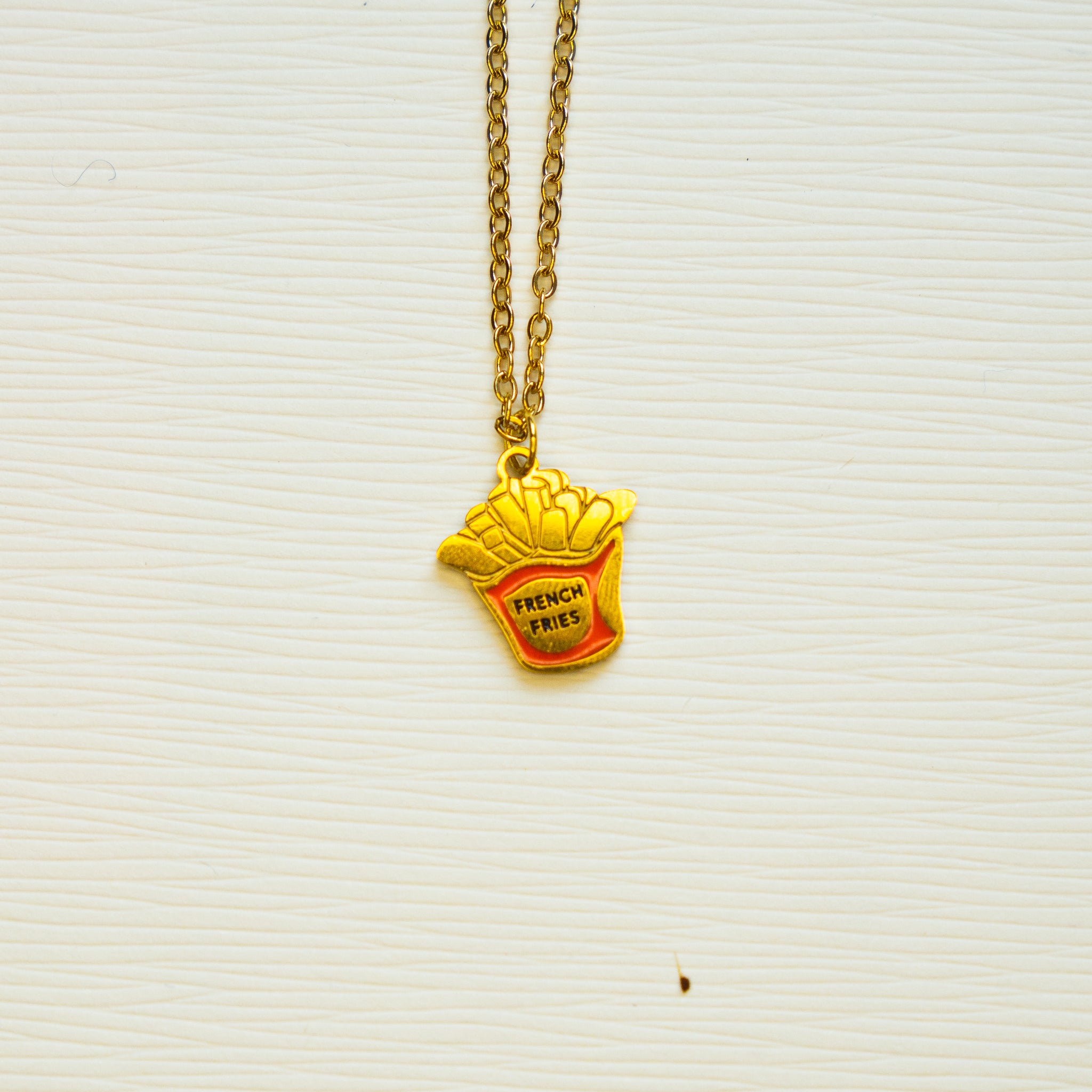 Get crispy with this fun french fry charm necklace! Celebrate your love of golden, salty goodness with this cheeky accessory that brings fast-food flair to your everyday style. Whether you're treating yourself or surprising a fellow fry fanatic, this necklace serves up personality with a side of sass. A delightfully quirky way to show the world what you're really craving!