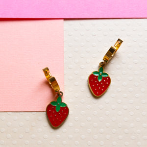 Featuring vibrant red Strawberry charms dangling from sleek hoops, they're perfect for fruit lovers and fun fashion enthusiasts alike. Lightweight and comfortable for all-day wear, these earrings add a delightful touch of whimsy to your everyday style or special occasions. A fruity favorite that's sure to turn heads!
