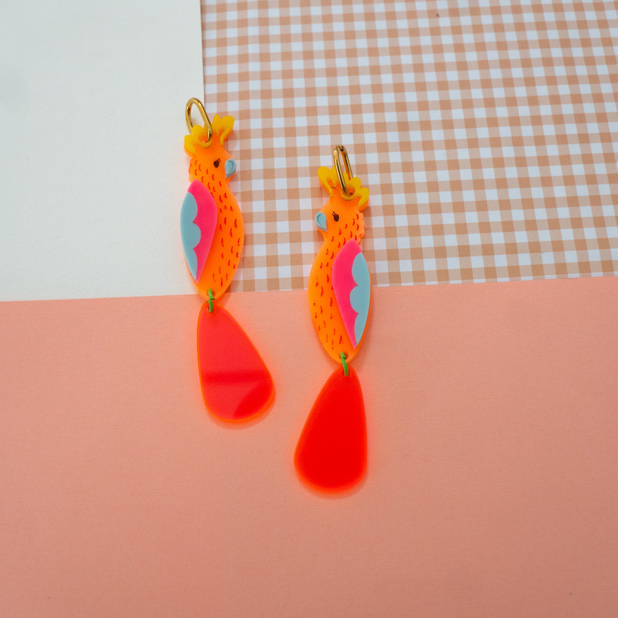 Beautiful birds inspired by the pink cockatoos. Made from acrylic and stainless steel with hand inked and powder coated details.